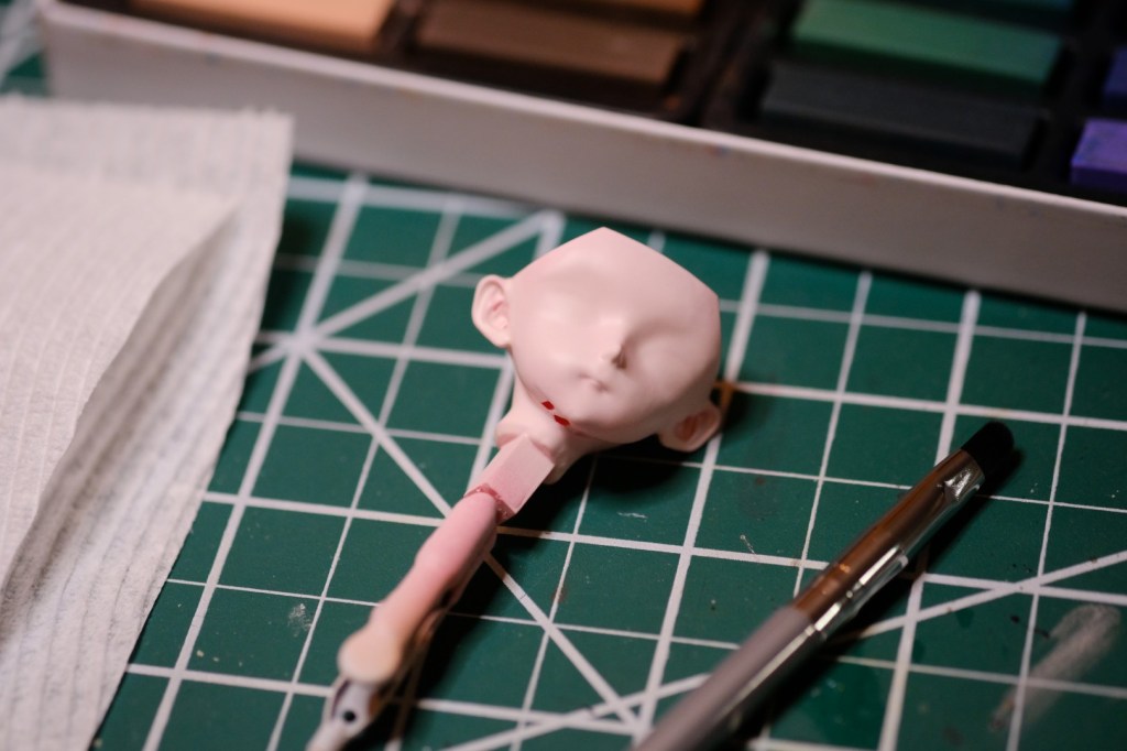 My favorite technique for doing the “makeup” on a garage kit is pastel shading. This involves scraping soft pastels into a pigmented powder, then brushing said powder onto areas where you want to add a little color. It’s highly controlled and easily reversible, which is great when you’re like me and you’re never quite satisfied with the final result, and you end up wanting to strip everything off and redo it, ad infinitum… 😬