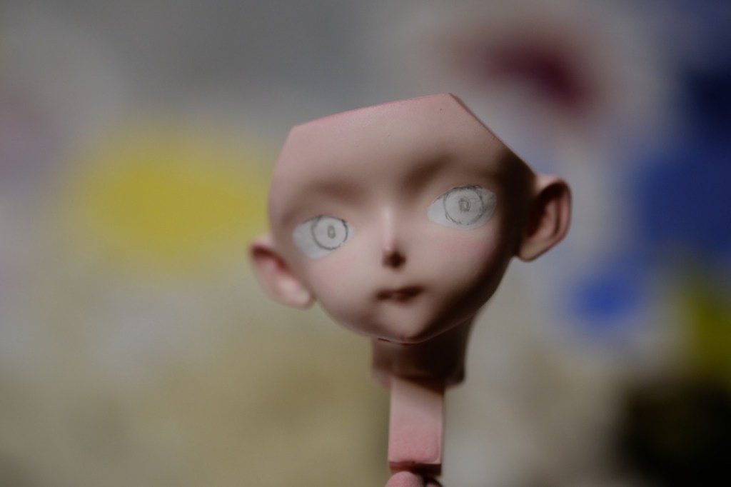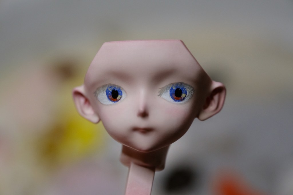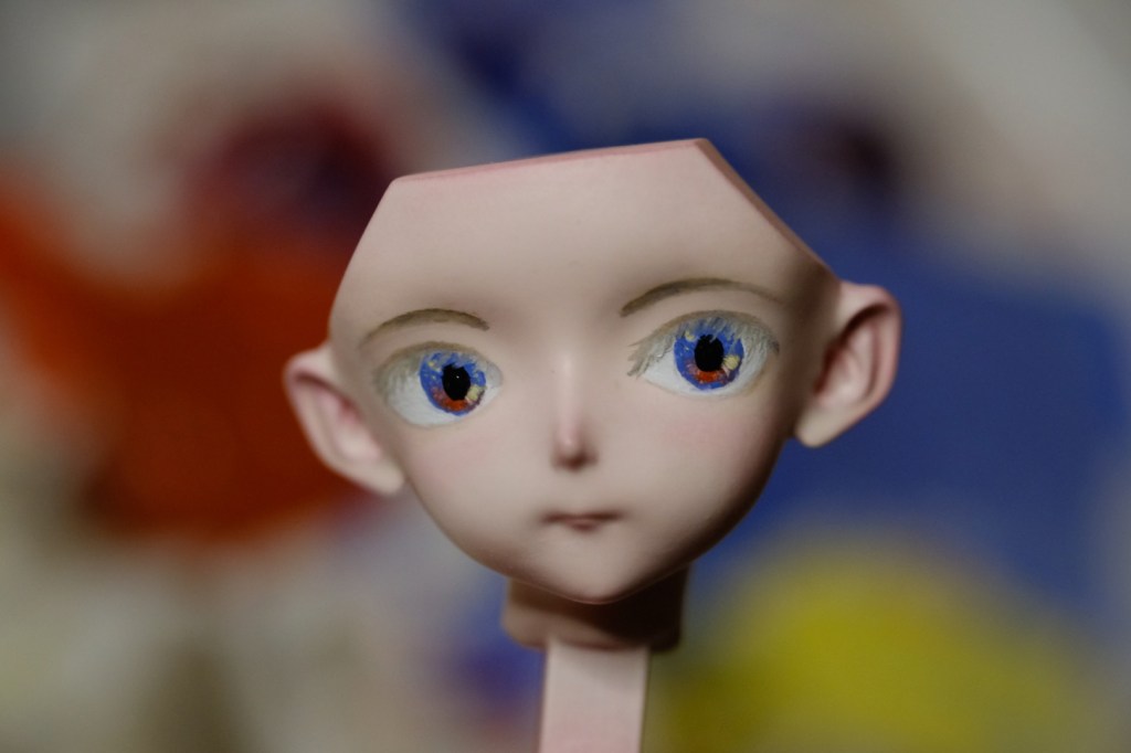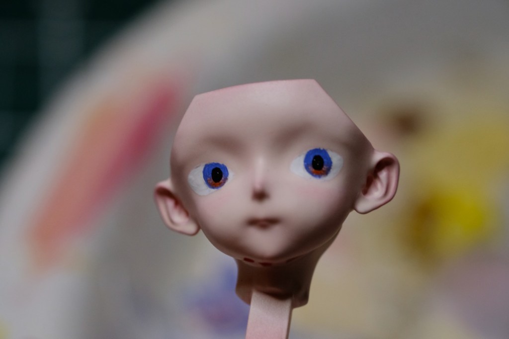 There are definitely some things I’d change for next time. I added shading to the tops of the eyes to represent the shadows of the eyelashes, but they ended up being almost completely covered up by said eyelashes. I’ll have to bring the shadows down farther down next time. Also, the white ended up being a little too bright and should have been toned down. The acrylic white I usually use is more transparent than this oil white, so I’m used having a little bit of the skin tone show through to lend a more natural color to the eyes. Pure white eyes can look like they’re glowing, which is not the effect I’m going for here.