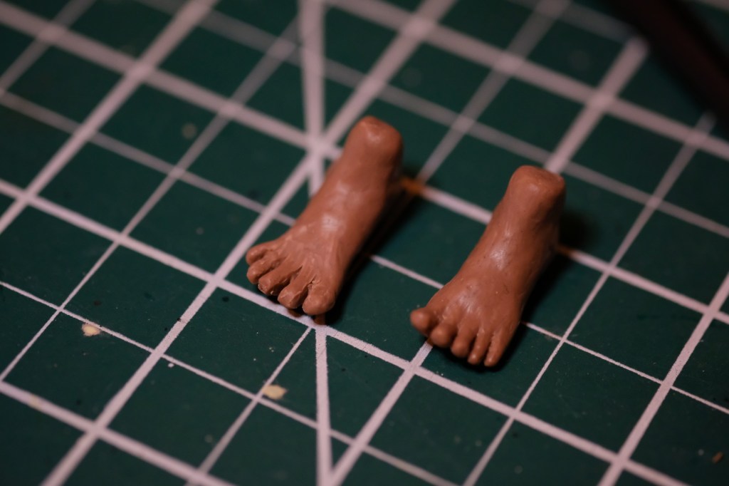 While I was at it, I also roughed out the feet. I simply made two foot-shaped blocks and then sliced the toes apart. In the picture, the two feet are in different stages of finishing: you can see that the toes on the left foot have been rounded off and refined compared to the right foot.