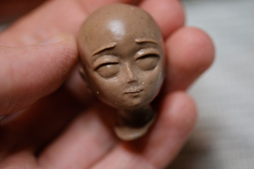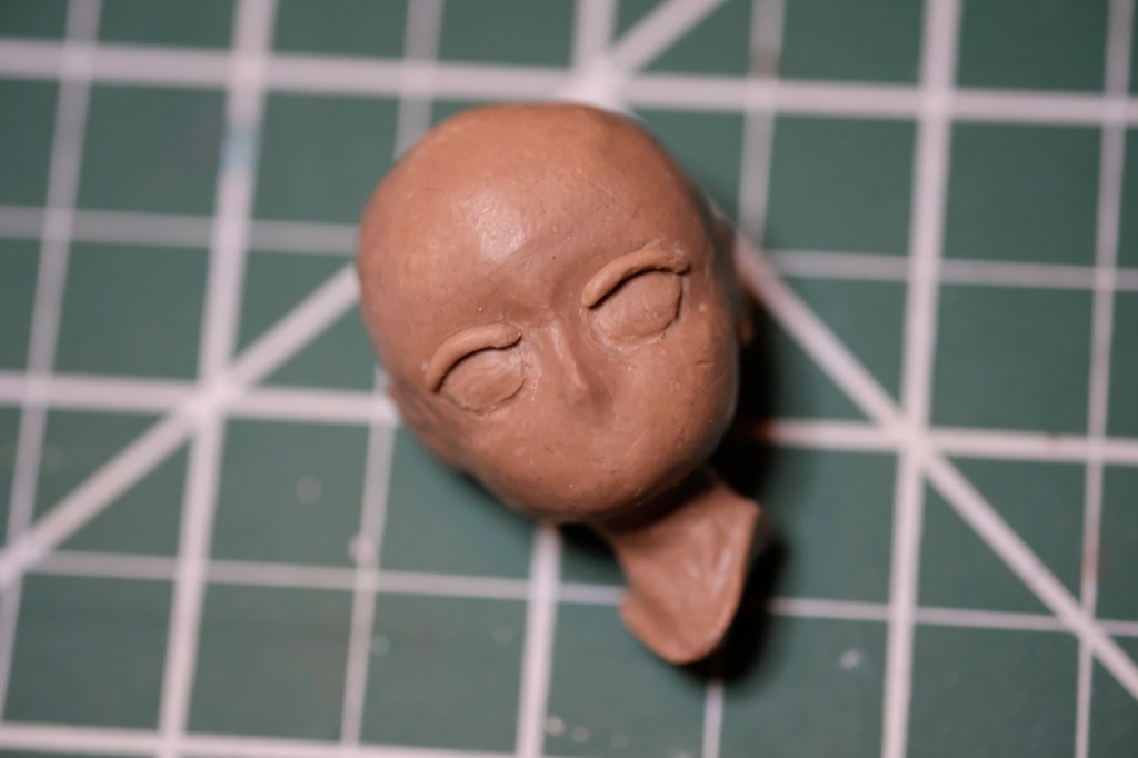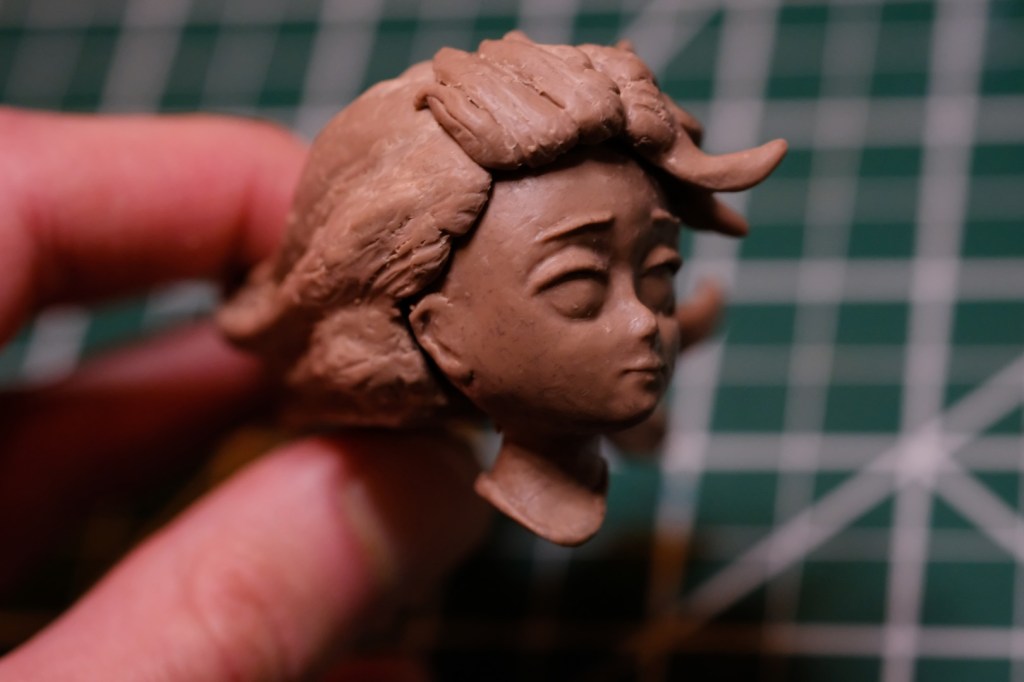 For the nose, I originally intended to have an anime-style featureless nose, mostly just suggested rather than being fully sculpted in. Once I’d added the other facial features, however, I felt like it didn’t really match the rest of the face. I decided to give her a proper nose, scooping out the bottom and adding a little more clay for nostrils. Still small and cute, but at least it’s an actual nose. I guess she’s going to end up more Disney-style than anime-style.