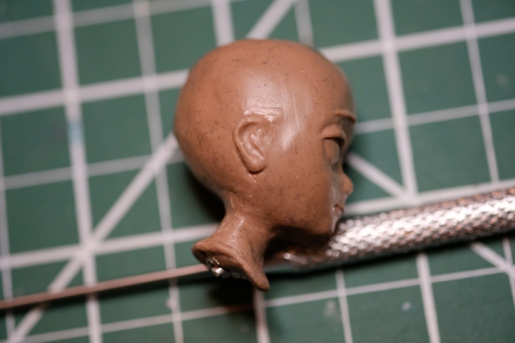 The head, the bangs, and the back hair parts were all sculpted in separate pieces. Like with the neckline, this separation will make the parts easier to paint. This is especially true with the face, since the bangs drop down to cover up parts of it when everything’s assembled.