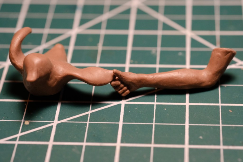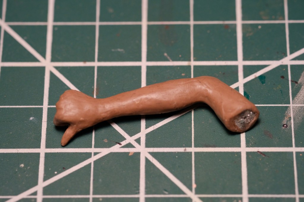When at last I was happy with the cut-out fingers, it was time to shape them, using a loop too to cylindrify (is that a word? Spellcheck isn’t flagging it 🤔) the straight parts while leaving the joints more-or-less square. I also realized that the knuckles looked flat and added some tiny pieces of clay to raise them up.