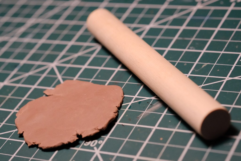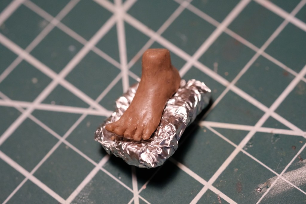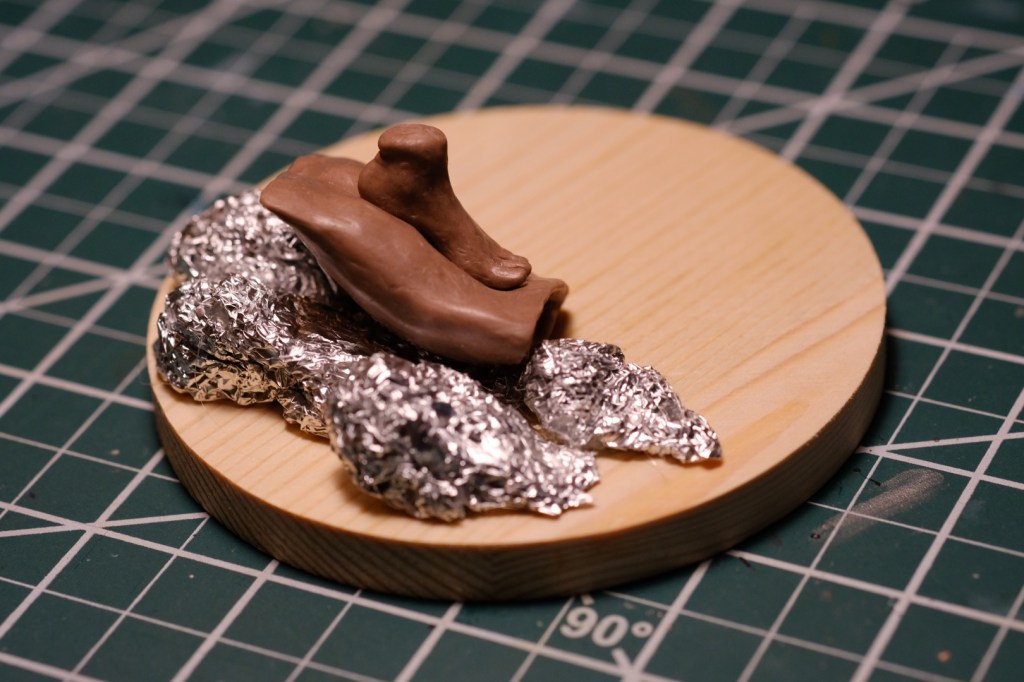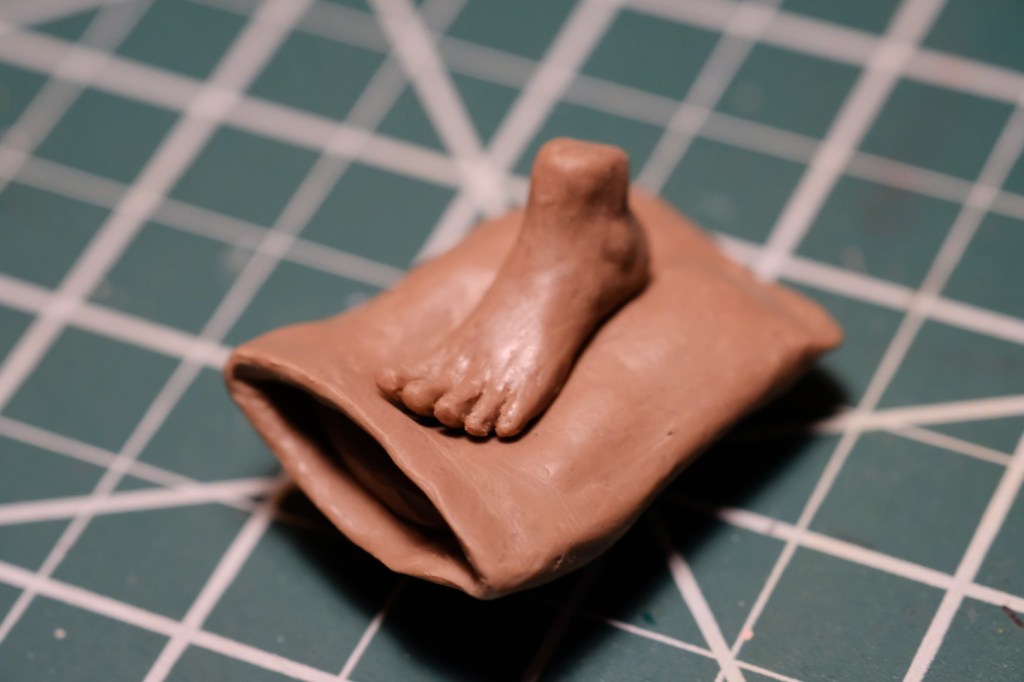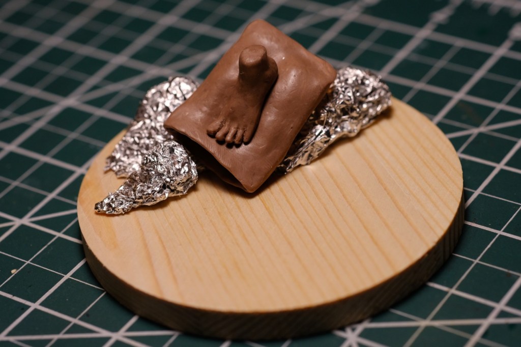 I started off by crafting the pillow. This was a pretty simple sculpt. The core is just a piece of aluminum foil crumpled up into the approximate form that I wanted. Crumpled foil is great for this because it provides a sturdy structure while still being malleable enough to reshape if needed. I then rolled out a couple of clay sheets, cut them to size, and wrapped them around the foil to create a pillowcase, leaving an opening at one end. I created an indent conforming to the shape of the foot to create the impression of some weight. I kept the indent shallow, though, because I didn’t want it to look like Yume-chan’s full mass was on the pillow; I wanted to preserve the sense of flight and floating.