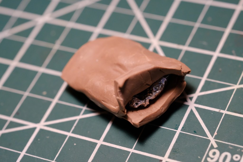 I covered up the sliver of exposed foil with another small sheet of clay so that it looked like a pillow inside the pillowcase. In hindsight it would have been easier to do this first, before the workspace was confined to that tiny little opening. Alas, I did not think it through… story of my life. 😐