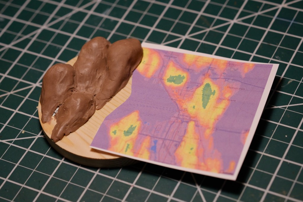 I did the shorelines first, placing down thin strips of clay, forming them to the shape of the coast, and then refining and sharpening the edges with a small ball tool. I left out most of the fine details, particularly things like piers. It’s not perfectly accurate, but it should be immediately recognizable to anyone familiar with the area. If you’re not familiar with it, everything surrounding the bay is part of Seattle. Downtown is located at the innermost part of the bay. The Space Needle is located at the northern end of downtown. Now you know!