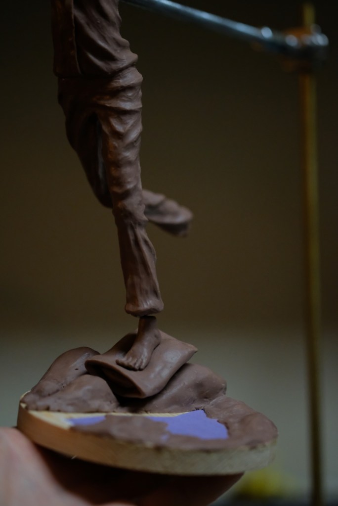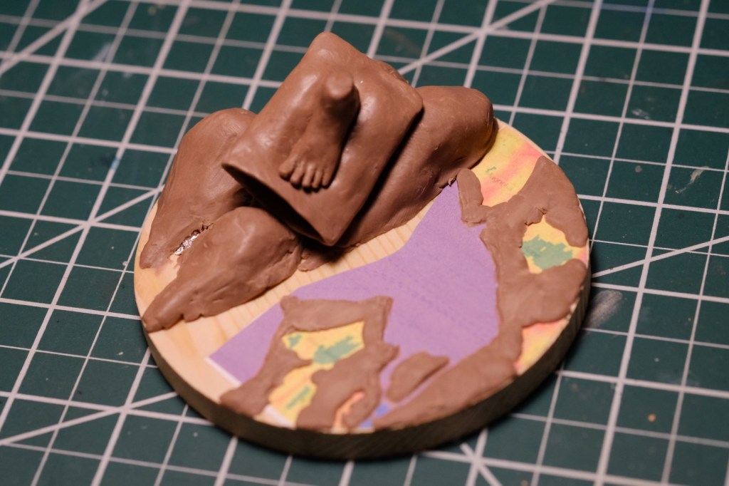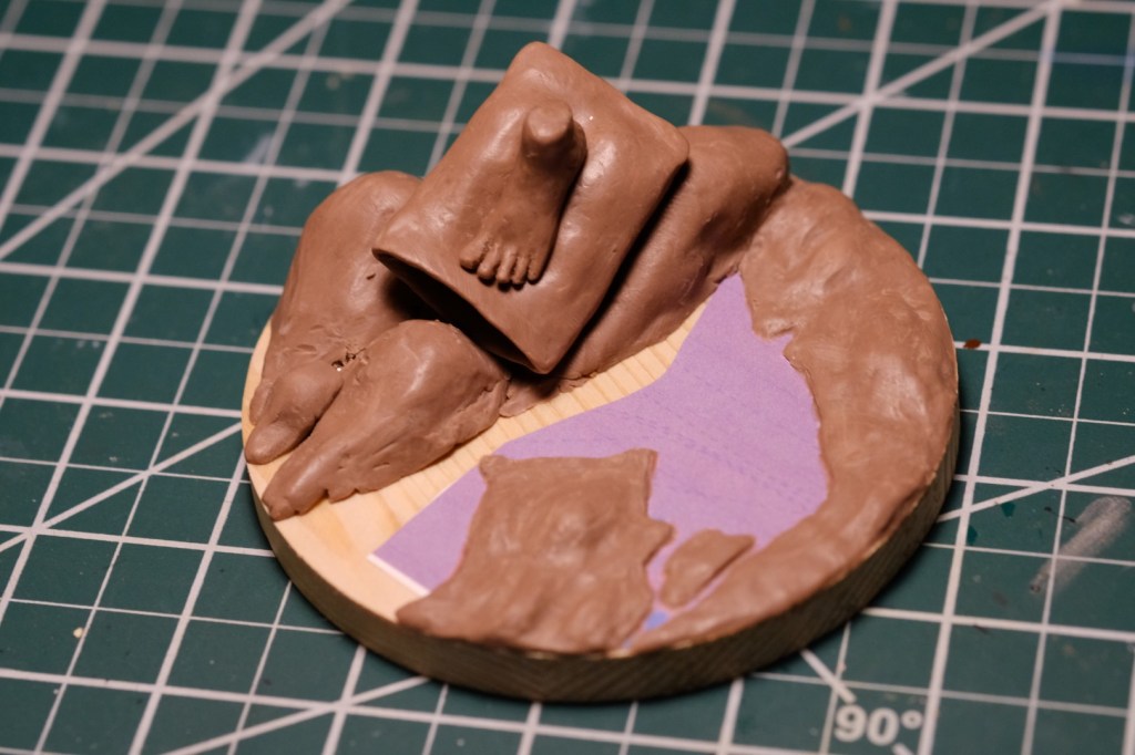 Just as with the pillow, I then covered the foil in clay sheets. I kept the cloud shapes simple for now, really nothing more than an “artist’s interpretation” of clouds. I may add some more texture to them, but I don’t plan to go too far with the details; I don’t want the clouds to get so busy that they distract from the figure itself. Besides, you can still tell what they are… right?