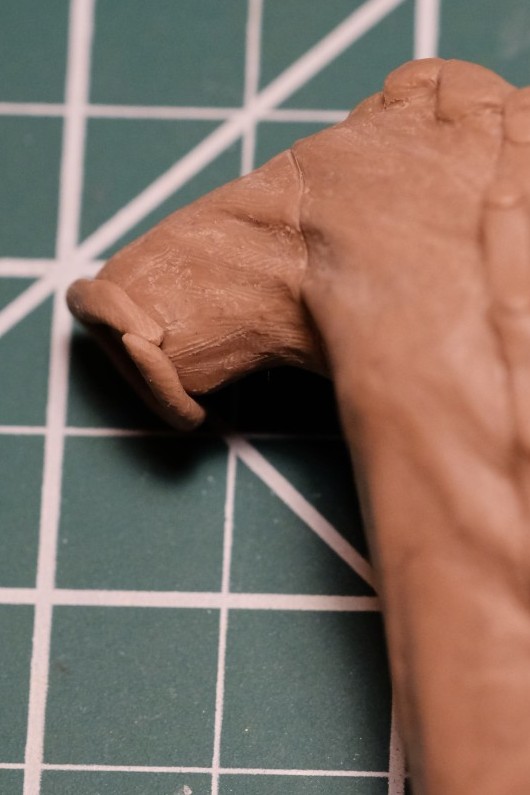 I added some rings of clay to extend the edges of the sleeves so that they covered the ends of the arms, giving the impression that the skin continues under the fabric. I formed these sleeve extensions to shape and then blended them in to the rest of the sleeves. I added a hem as a final touch. It’s those little details that really bring a sculpt to life!