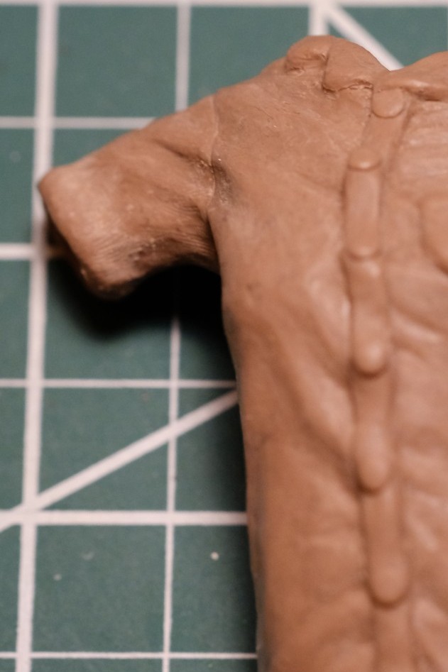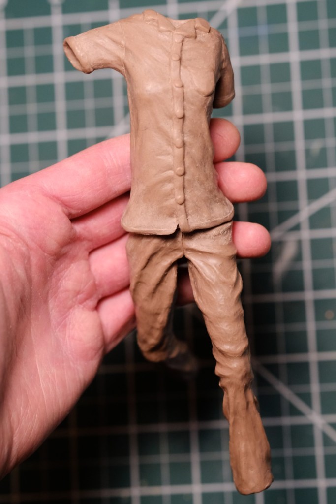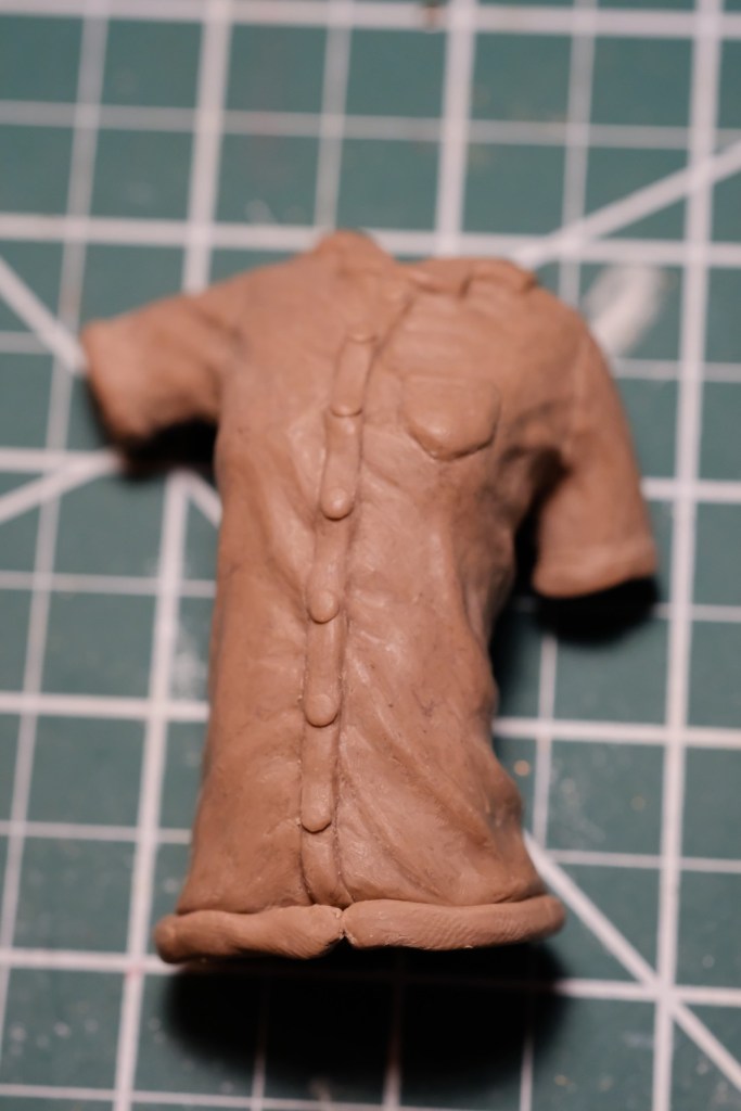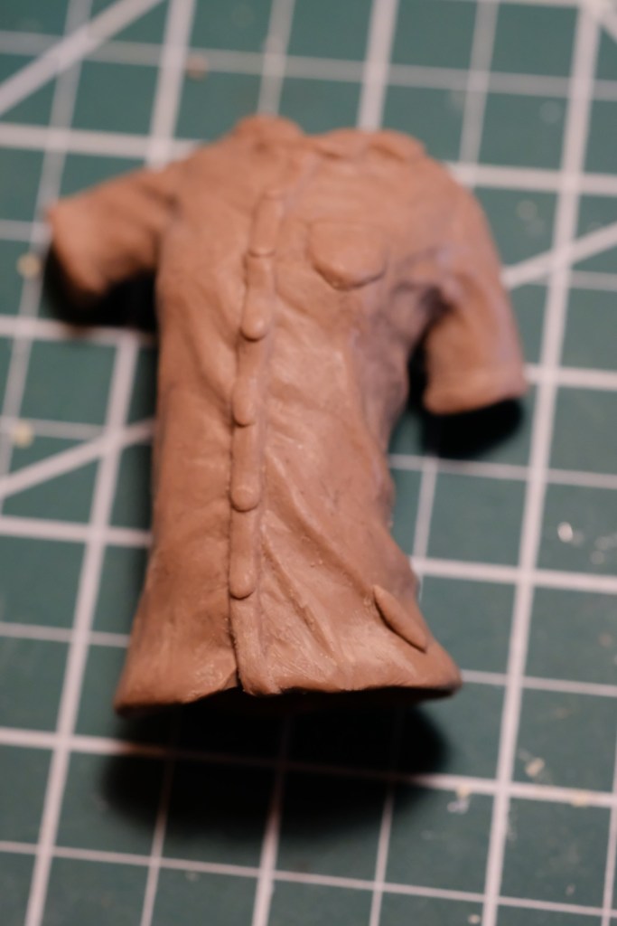 Once satisfied with the fit, I carried all the details down to make the whole thing cohesive. You can see where I added little rolls of clay to extend the wrinkles, as well as the strip of fabric where the buttons are (which is apparently called a placket! I looked it up after writing this. The more you know!).