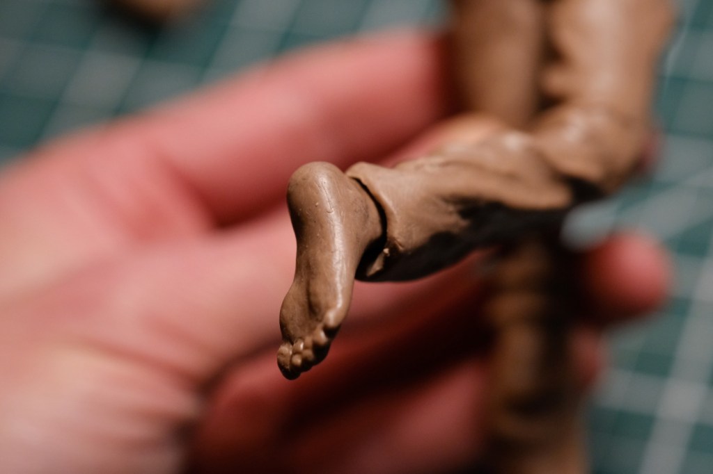 The pant legs were next. You know the drill by now. Ring of clay, form to shape, blend, fix the fit, repeat steps 2 and 3 as necessary… Arms, ankles, what’s the difference, really?