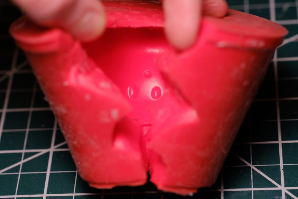 Using an Xacto knife with a fresh blade, I sliced open the mold along the backside that I marked earlier. I cut in zig-zag motions to create uneven edges, which help lock the two sides of the mold together and keep them aligned. In hindsight, though, I went a little too crazy with my zigging and zagging, which ended up making the seamline awfully conspicuous. I used raging waves of zig-zags where I’d have been better off using a gentle ripple motion. Now I know. Think calm seas, not stormy ones. This is why it’s good to test on a guinea pig. (Sorry, ghost!) 👻