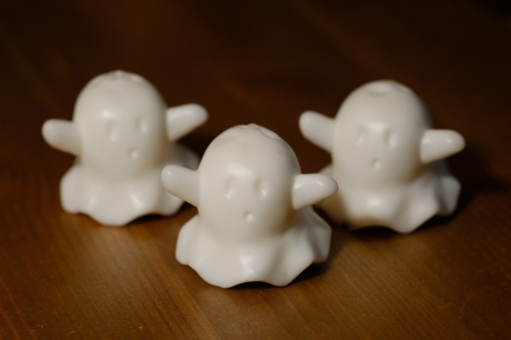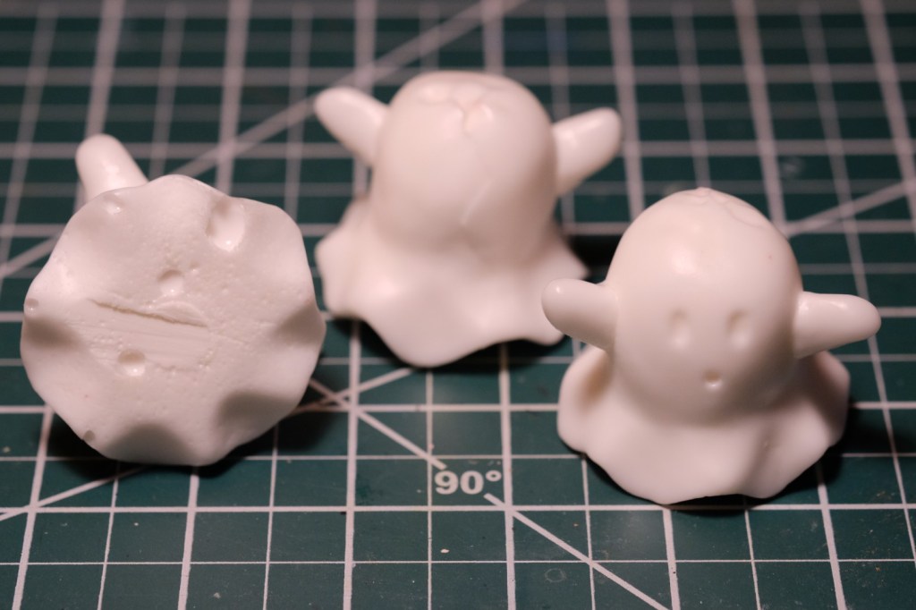 I did it a couple more times after that. Despite the many flaws (janky seamline, bubbles galore on the bottom, ripples on the top where the mold was thin), it was quite exciting to see the little ghost multiply before my eyes.