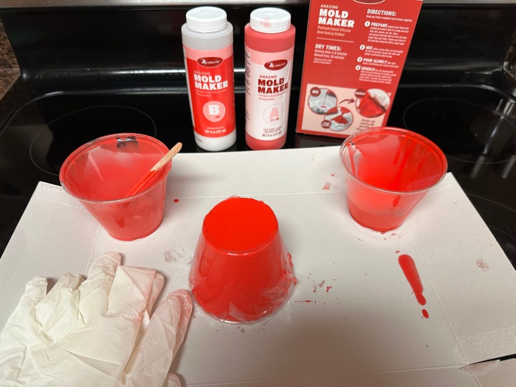 This particular two-part silicone needed to be mixed in equal parts by volume, although there are other varieties that use different measurements. So read the instructions if you plan to do this! I poured the mixture into the prepared container and waited about half an hour for it to set.