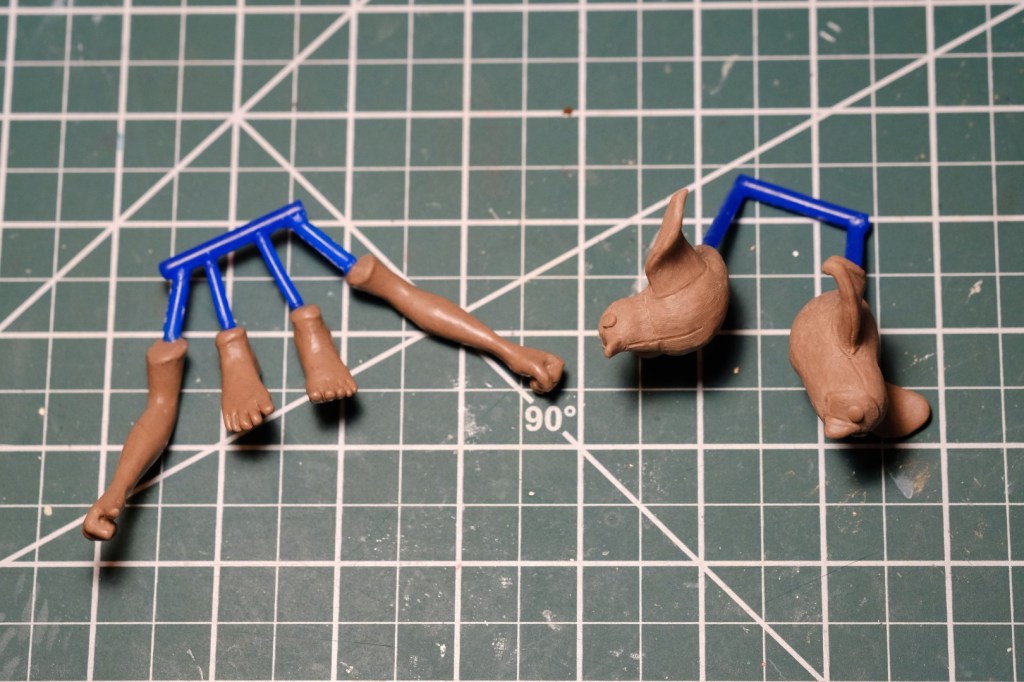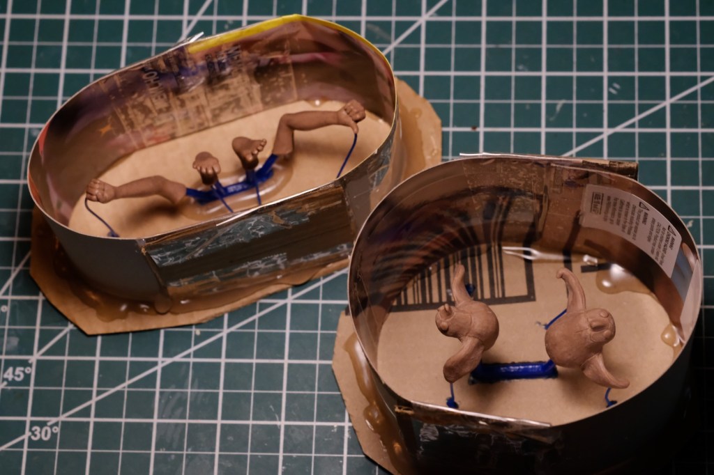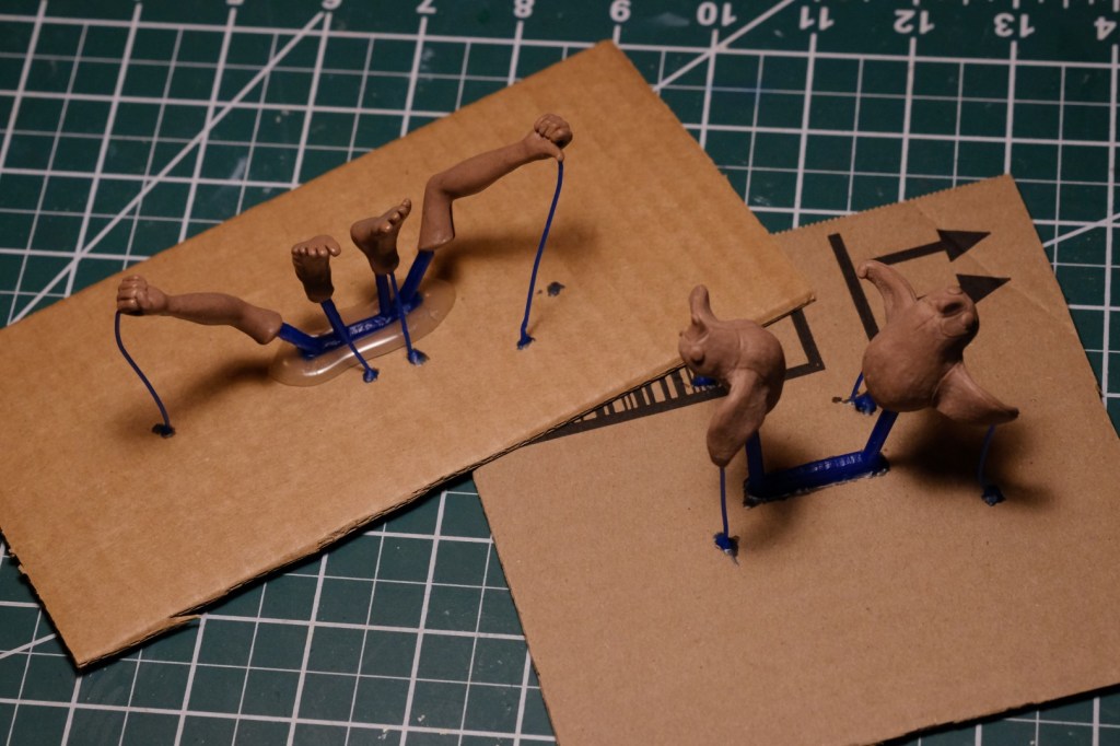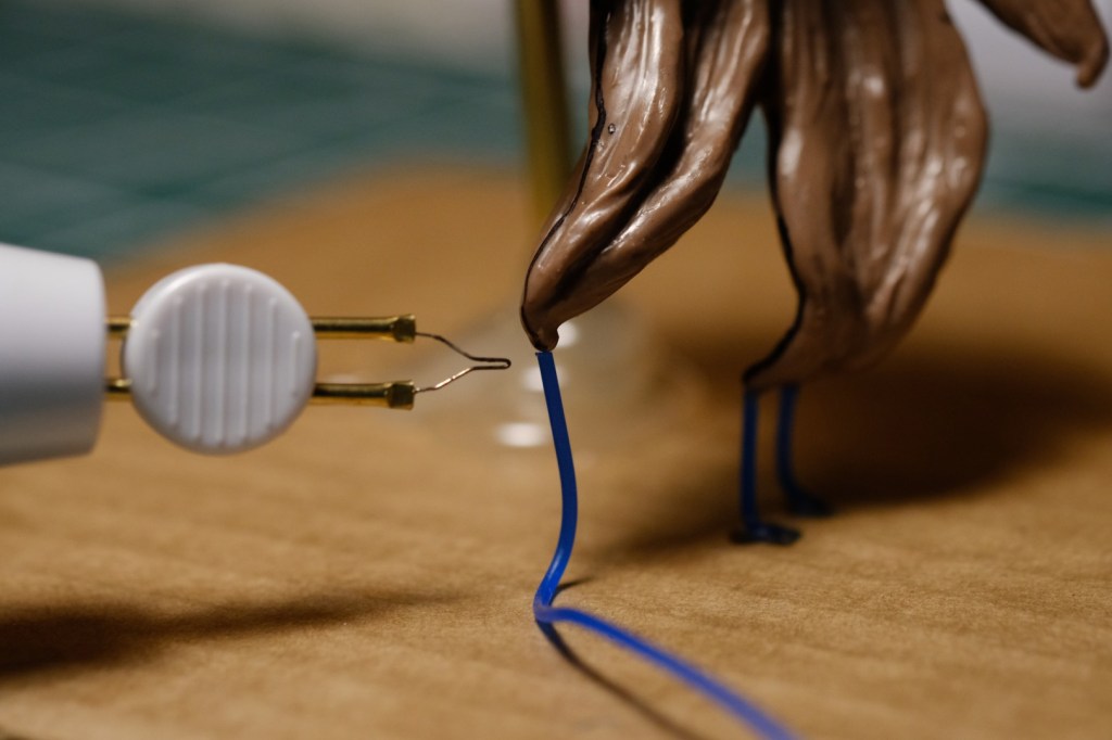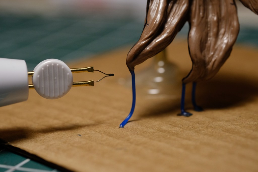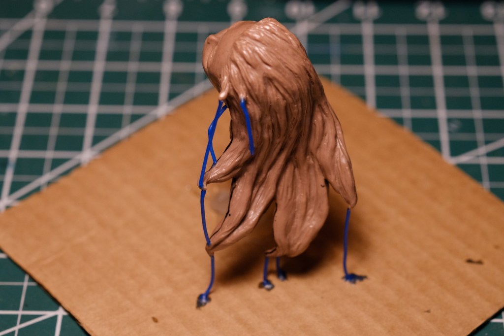 For the stuffed animals, I came to my senses and just melted some extra wax to secure the sprue onto the cardboard. It still introduces heat, yes, but it can be applied with much more precision and it solidifies much faster. Works much better that way!