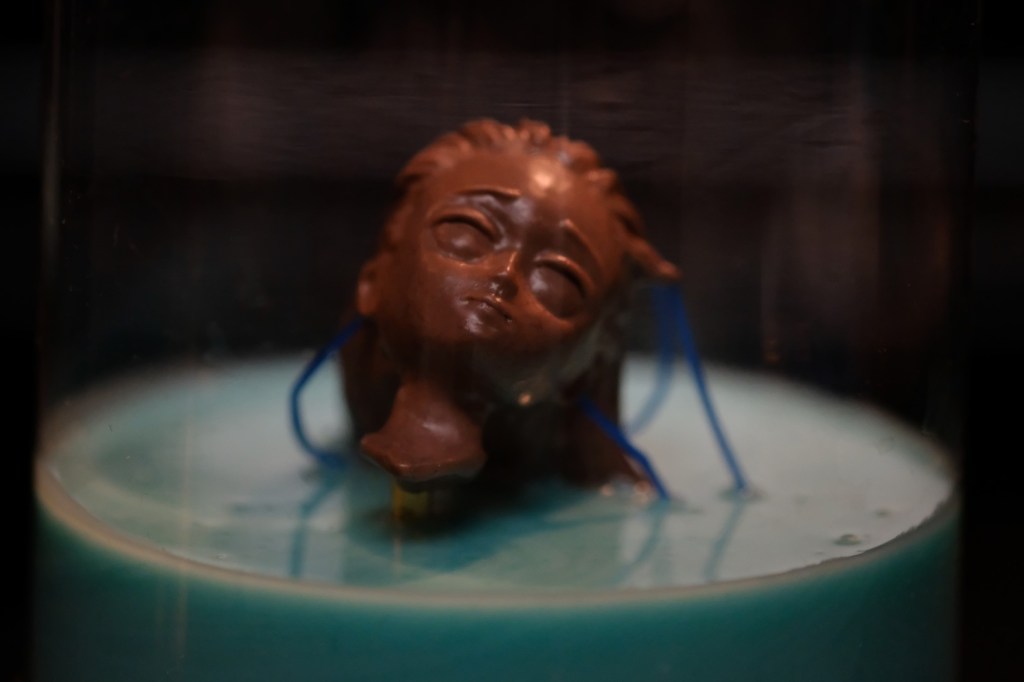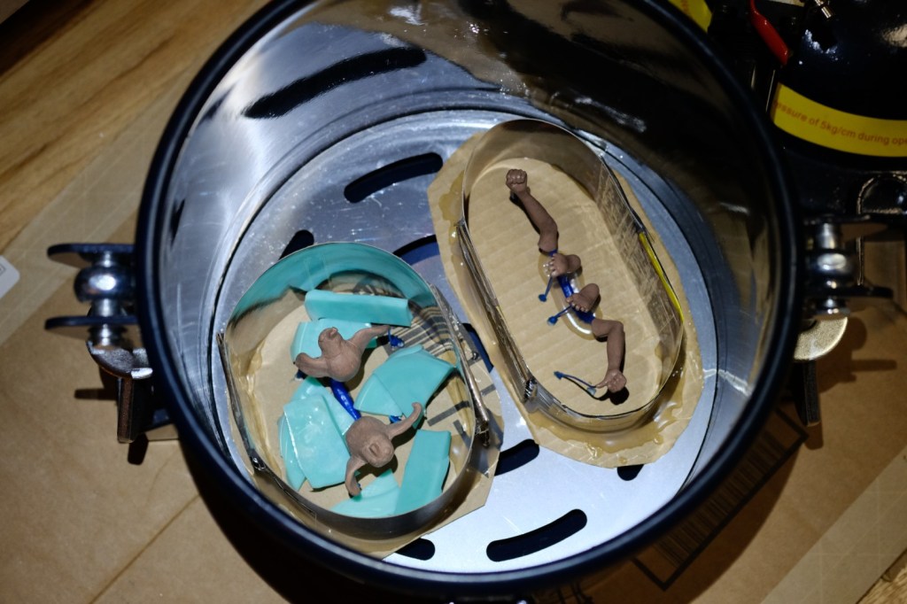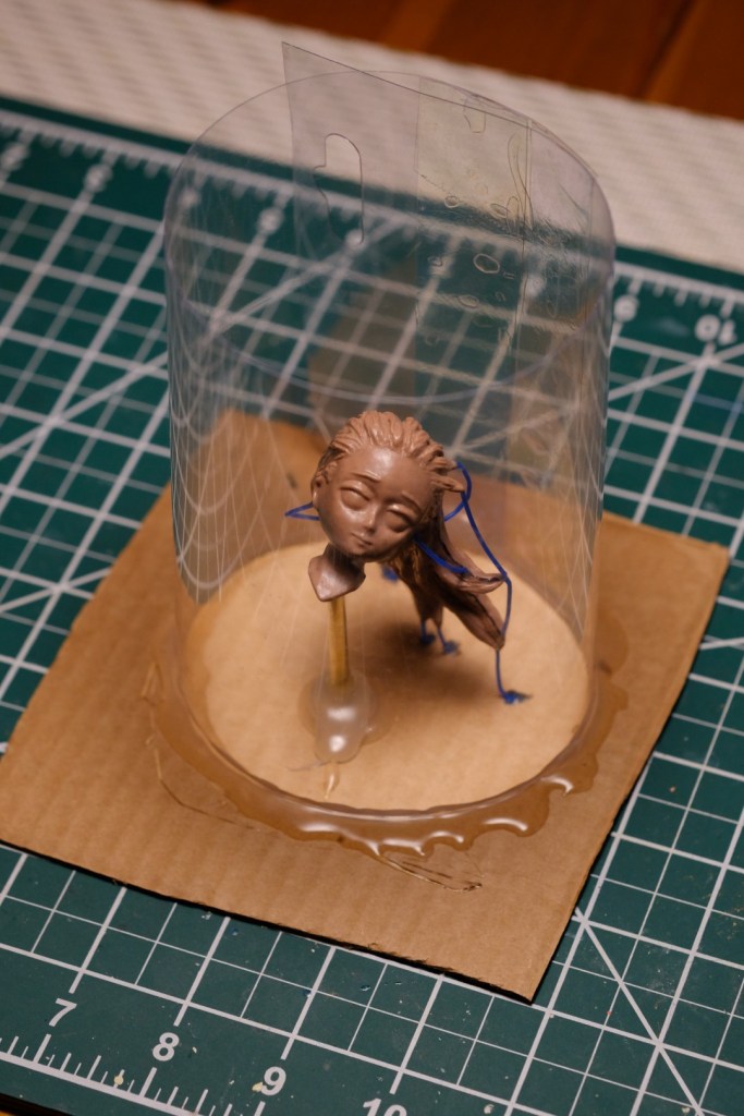 Since this was a special mold, I saved a clear sheet of plastic from some packaging to turn into the mold walls. This way I could watch the head from all angles as the silicone filled up around it. Why did I want to do this? I’m not sure myself. Maybe it’s just because it’s neat to watch, but I’d like to think it’s a way of saying goodbye to Yume-chan’s face after putting so much work and soul into it. Hopefully there’s not some subconscious part of me that was sick of the frustration of sculpting and just wanted to watch it drown…