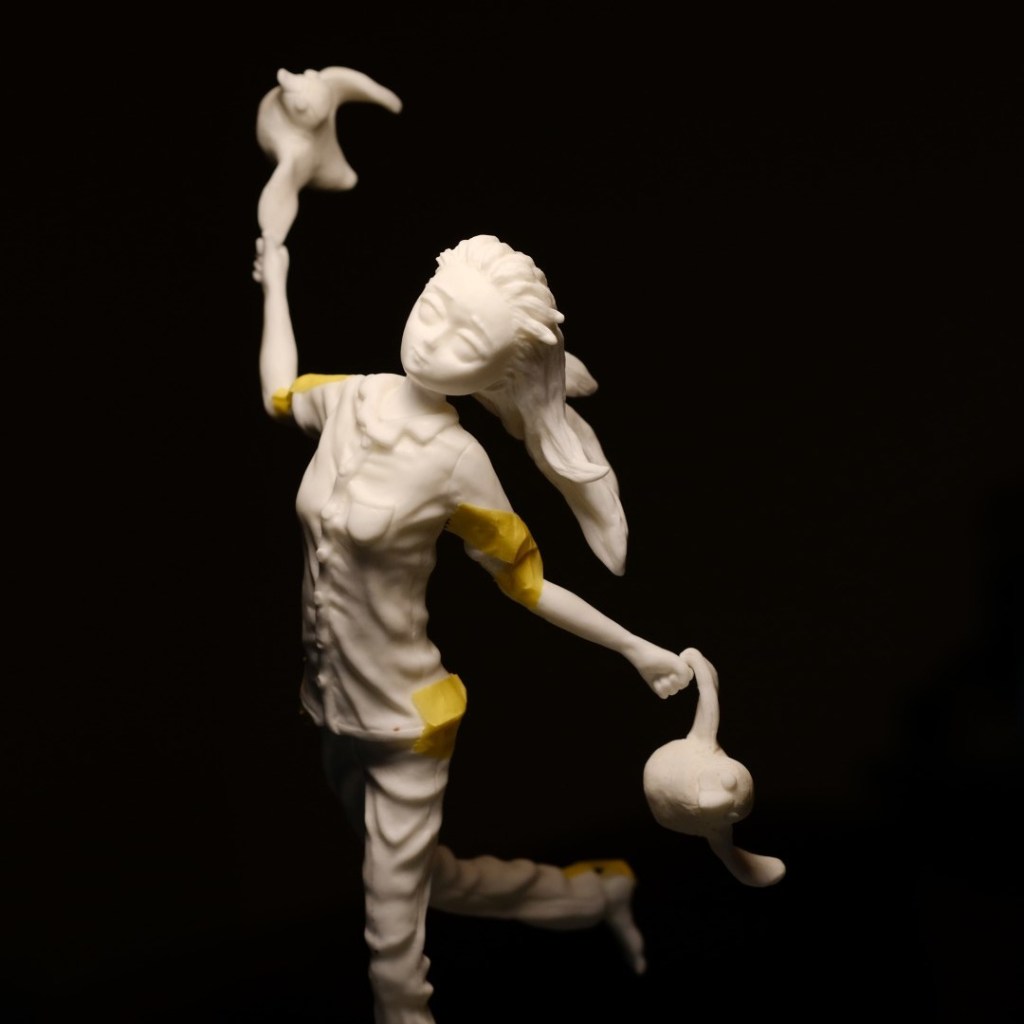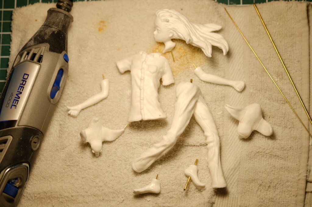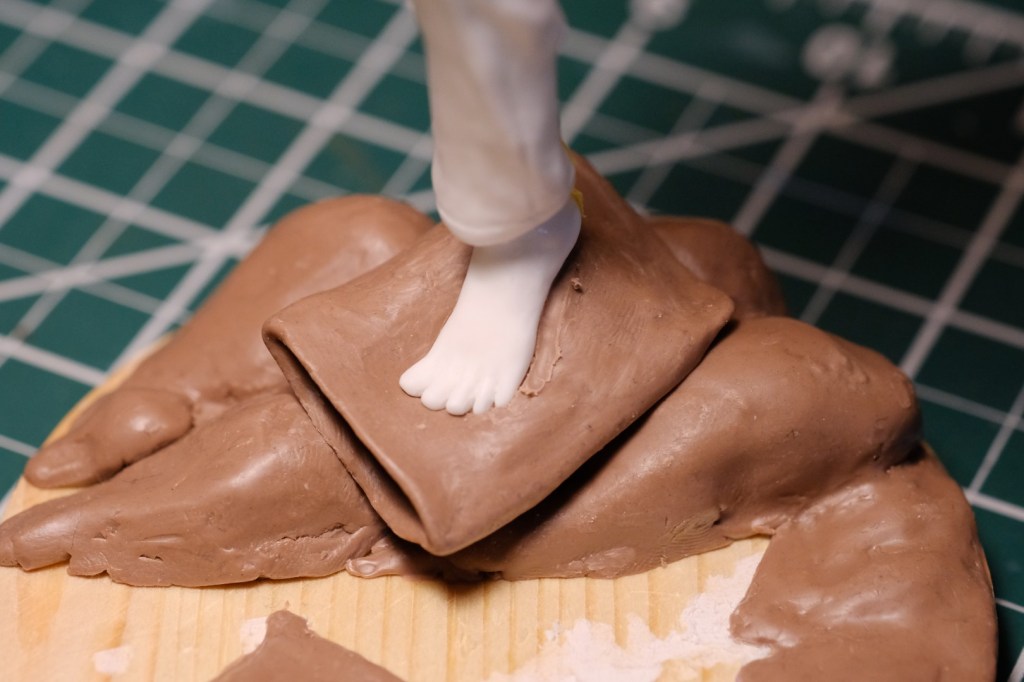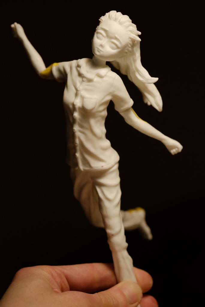In order to finalize the mounting position of the figure on the base, I assembled it temporarily, pinning the parts together but not yet gluing them in place. This meant that, to my frustration, parts kept spinning around and falling off… but at least it was enough to see how Yume-chan would look when mated to the base! Once I was satisfied with the angle and the balance, I pressed the foot down into the pillow to leave an indent. When you assemble the figure, you can just match the foot to the foot shape. Easy!