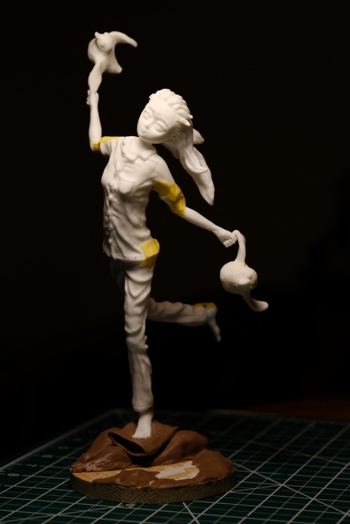 Once all that was done, I sprayed the base with a top coat to seal it against the mold silicone. This isn’t a concern with clay pieces, but the base is built on a piece of wood, which can be absorbent. I wanted to prevent the silicone from intruding into the wood and creating problems with the mold. The end grain around the edges was particularly rough, so I added some putty to fill the gaps and coated it with surfacer to smooth it over. I debated sanding down the surfacer to create a perfectly even look, but after looking the piece over I decided that I actually liked the irregular texture that it has. It adds a little bit of visual interest, and it matches the slightly-unrefined texture of the rest of Yume-chan’s sculpt. In hindsight, I should have invested more time into smoothing down said sculpt before I cast it into resin, but that’s a different story…